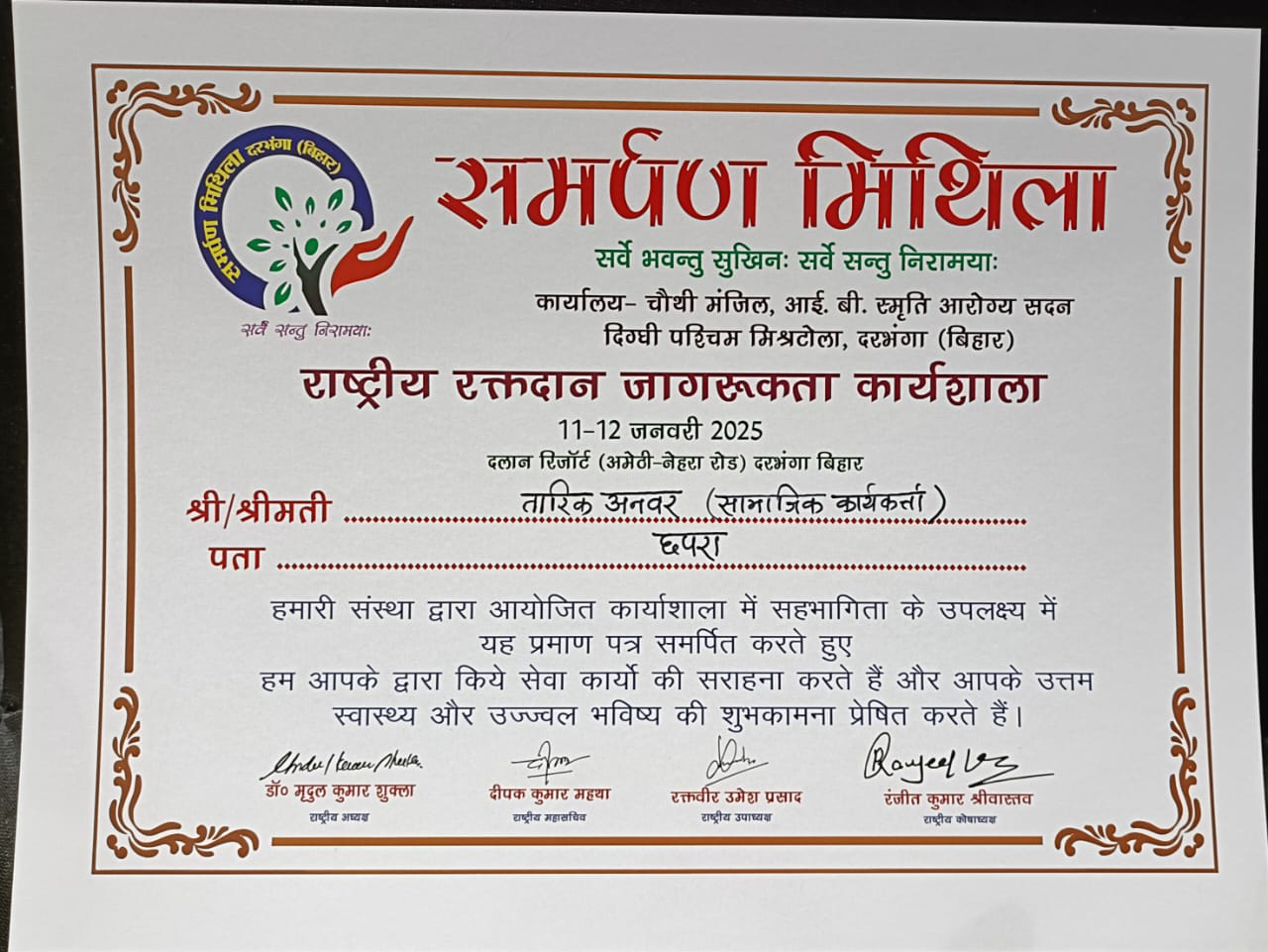 बिहार के दरभंगा जिला की बहुचर्चित संस्था समर्पण मिथिला द्वारा 11- 12 जनवरी को ऐतिहासिक दो दिवसीय राष्ट्रीय रक्तदाता प्रतिनिधि सम्मेलन का आयोजन किया गया था जिसमें देश के अलग अलग राज्यों से रक्तदान क्षेत्र में सेवा दे रहे रक्तदानियों एवं संस्थाओं को सम्मानित किया गया। छपरा से युवा सामाजिक कार्यकर्ता व रक्तवीर तारिक़ अनवर को रक्तदान के प्रति जागरूकता अभियान चलाने, रक्तदान शिविर का आयोजन करने, एवं अब तक सैकड़ों जरूरतमंद लोगों को रक्त उपलब्ध कराने के लिए संस्था के राष्ट्रीय अध्यक्ष डॉ० मृदुल कुमार शुक्ला व डॉ ० गुंजन शुक्ला के हाथों "राष्ट्रीय सेवा रत्न सम्मान" से सम्मानित किया गया।